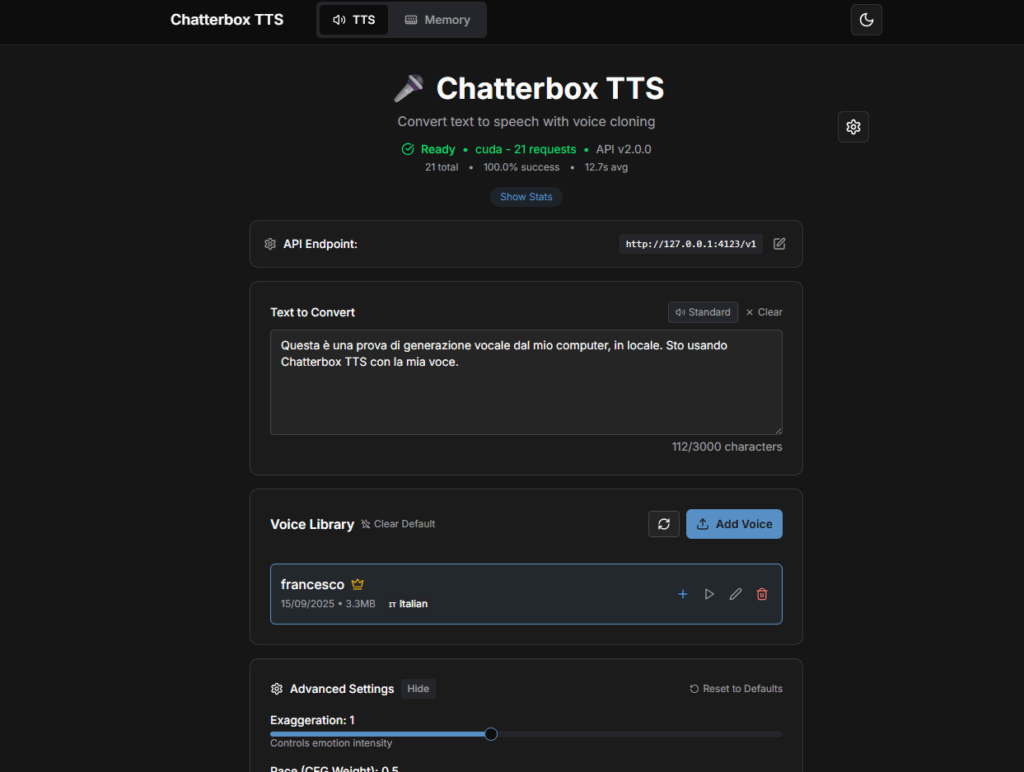 - In locale Chatterbox TTS è tra i motori più semplici da mettere in piedi e integrare via API. Per assistenti vocali, demo e POC è già usabile (soprattutto su GPU). In italiano resta un po’ di accento/prosodia da rifinire per voice-over pro. Continuerò i test e aggiornerò il post quando usciranno preset/modelli migliori.